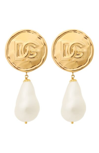 Основание этих крупных клипсов выполнили в виде неровной круглой пластины с рельефной монограммой DG. Аксессуар дополнили каплевидной перламутровой подвеской. Для изготовления модели использовали легкий сплав с гальваническим покрытием золотом.