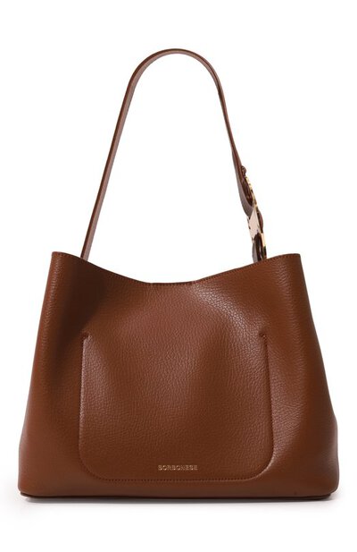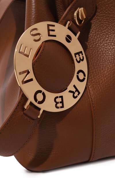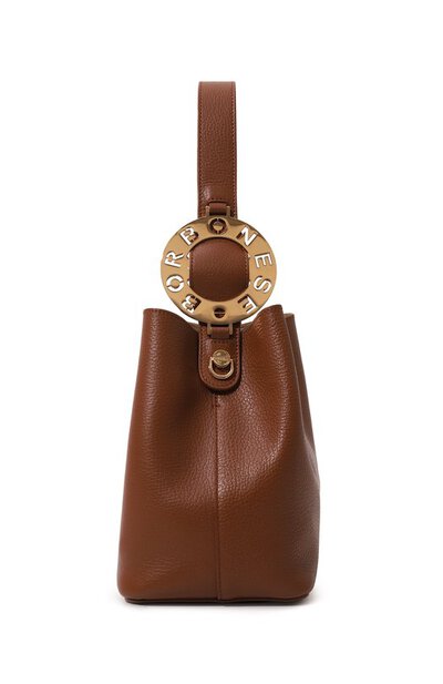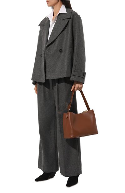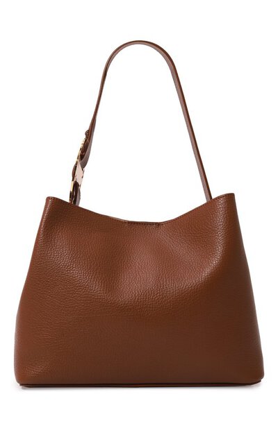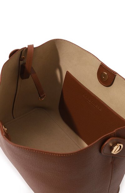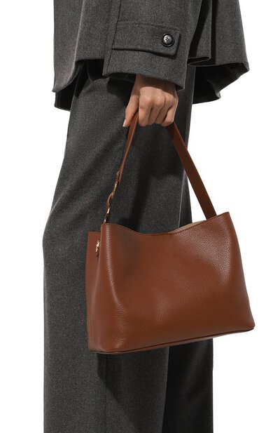 Название сумки 011 отсылает к коду города Турина, в котором основана итальянская марка. Для изготовления небольшой коричневой модели с удлиненными ручками использовали мягкую зернистую наппу с деликатным блеском. Роль главного акцента взяла на себя крупная золотистая пряжка, напоминающая диск телефона. В изделие поместятся планшет, кошелек, зонт и косметичка, включенная в комплект.