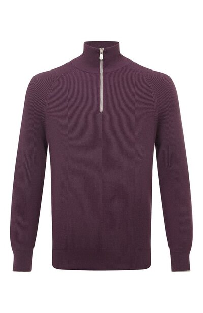 Фиолетовый однотонный джемпер с длинными рукавами реглан и высокой, как у водолазки, горловиной, застегивающейся молнией, выполнен из эластичного хлопкового трикотажа. Лаконичное изделие с рельефным узором хорошо пропускает воздух и садится точно по фигуре, не сковывая движения. Наши стилисты предлагают сочетать модель с черными джинсами и кремовыми футболкой и кроссовками.