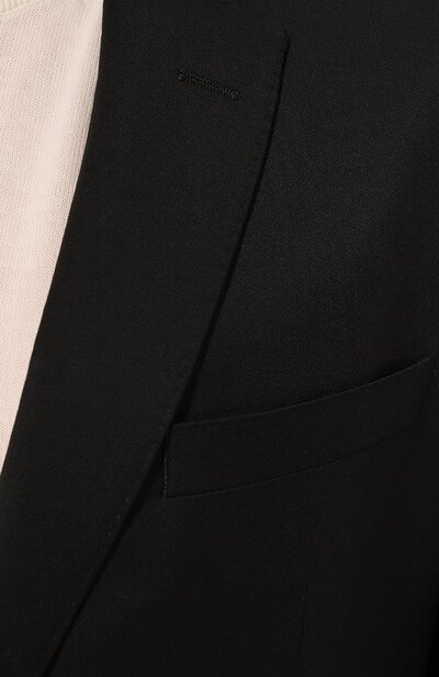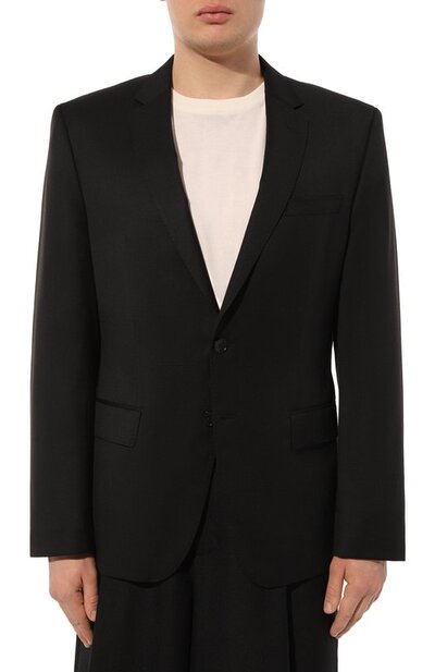 Пиджак с акцентированными плечами и узкими лацканами получился в равной степени элегантным и комфортным. Для пошива приталенной модели с двумя шлицами использовали тонкую шерсть.