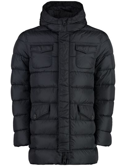 Black feather down black feather down front press-stud and zip fastening classic hood four front flap pockets long sleeves straight hem full lining