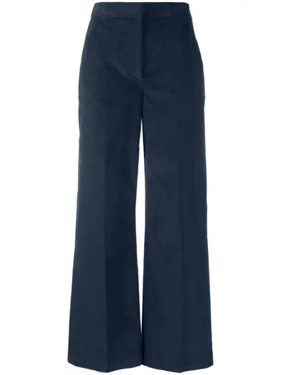 midnight blue cotton blend corduroy high-waisted concealed front fastening pressed crease two side slit pockets two rear welt pockets wide leg
