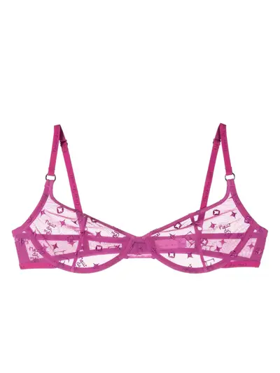 fuchsia pink tulle netting sheer coverage all-over monogram embroidery balconette style underwire cup adjustable spaghetti straps rear hook and eye fastening