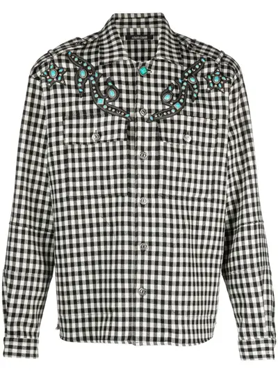 black/white wool blend gingham check pattern turquoise stone stud embellishment spread collar front button fastening long sleeves buttoned cuffs two button-fastening chest pockets straight hem