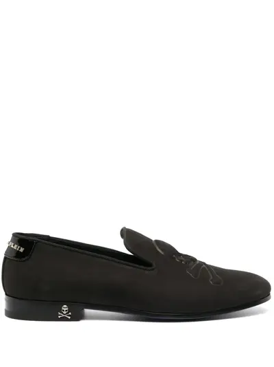 black calf suede skull embroidery to the front torchon piping detail branded heel counter grosgrain ribbon trim almond toe slip-on style branded leather insole leather sole