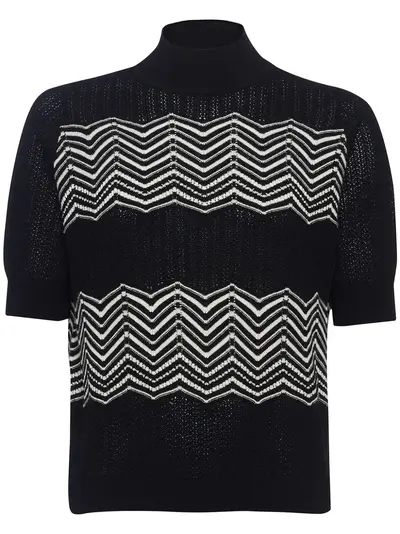 black/white wool-cashmere blend chevron knit mock neck short sleeves straight hem