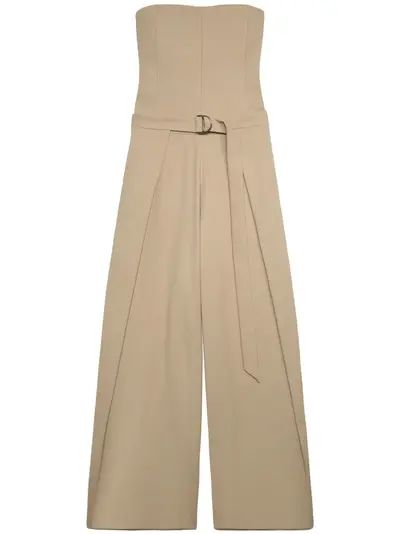 beige virgin wool blend strapless dart detailing layered details D-ring buckle belt wide leg
