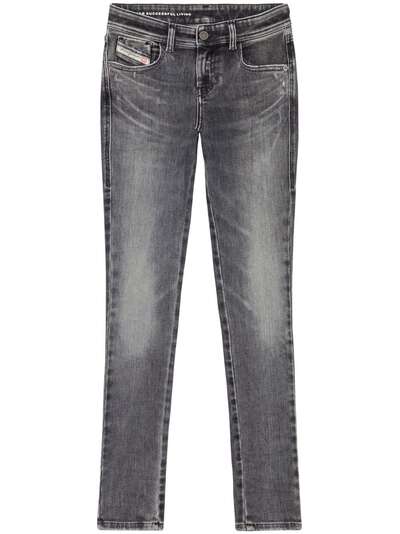 charcoal grey organic cotton blend faded effect whiskering effect logo patch to the rear super-skinny cut mid-rise belt loops concealed fly and button fastening classic five pockets