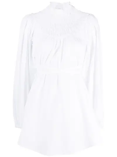 optical white organic cotton frilled high neck smocked panel long puff sleeves tied waist curved hem