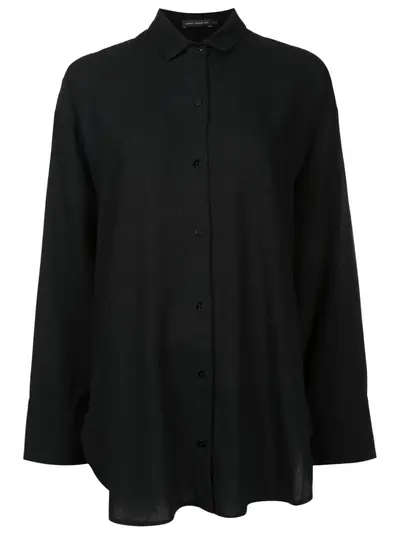 black stretch-design tonal stitching spread collar front button fastening long sleeves buttoned cuffs curved hem