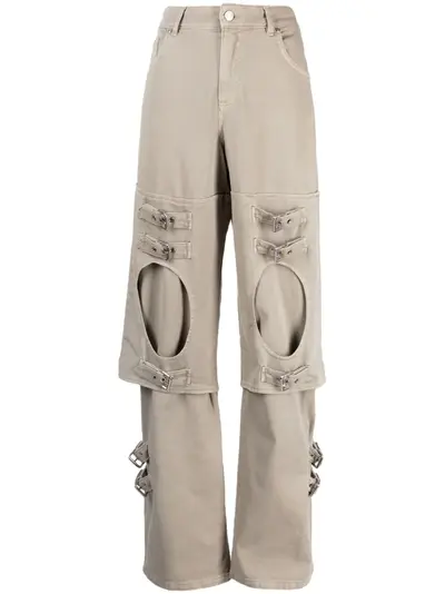 light grey stretch-cotton high-waisted twill weave belt loops front button and zip fastening classic five pockets decorative buckle detail wide leg
