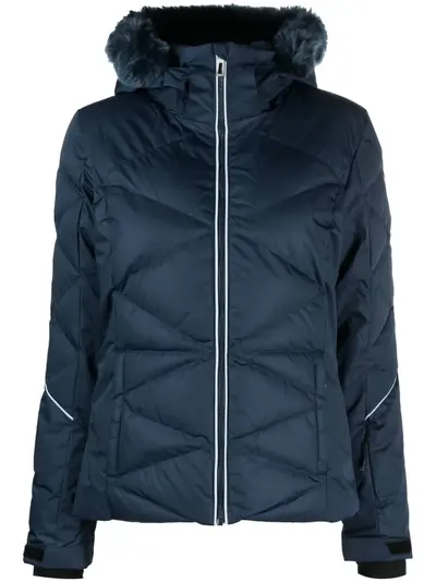 navy blue insulated design quilted logo print at the sleeve faux fur-trimmed hood detachable hood front zip fastening two side zip-fastening pockets long sleeves touch-strap cuffs thumb slots straight hem