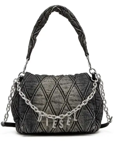 black cotton washed denim quilted silver-tone hardware silver-tone logo lettering single detachable top handle chain-link shoulder strap foldover top magnetic fastening main compartment internal logo patch internal zip-fastening pocket