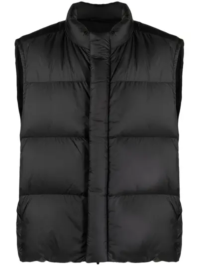 jet black down-feather filling quilted finish padded design funnel neck concealed front zip and press-stud fastening sleeveless two side inset pockets straight hem cotton lining