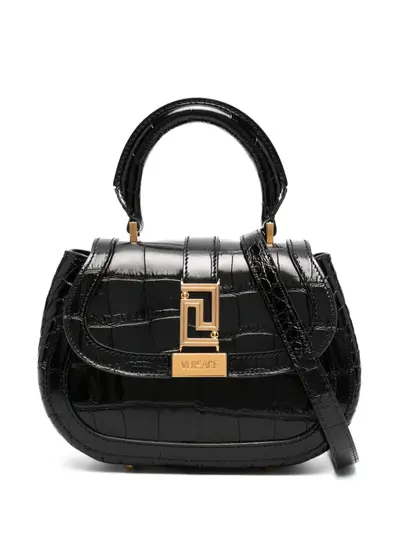 black lambskin/calf leather embossed crocodile effect logo-engraved gold-tone hardware signature Greca detailing foldover top with magnetic fastening single top handle detachable shoulder strap main compartment internal slip pocket