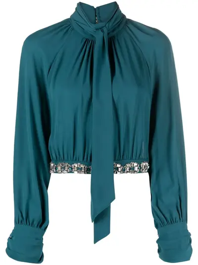 teal green georgette rhinestone embellishment gathered tie neck high neck concealed rear zip fastening long sleeves buttoned cuffs straight hem cropped