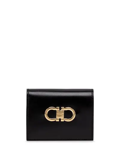 black calf leather bi-fold design gold-tone logo plaque press-stud fastening contrast lining internal logo stamp internal card slots