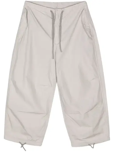 foggy grey cotton taffeta two side flap pockets rear flap pocket appliqué logo at the leg tapered leg drawstring ankles drawstring waist