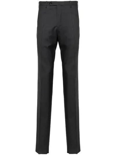 dark grey virgin wool mélange effect mid-rise concealed fly and button fastening belt loops two side slash pockets two rear button-fastening jetted pockets pressed crease tapered leg