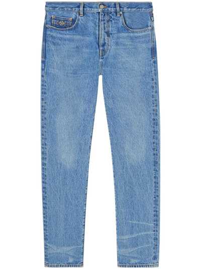 light blue cotton denim Medusa Head motif logo patch to the rear mid-rise belt loops concealed fly and button fastening classic five pockets straight leg