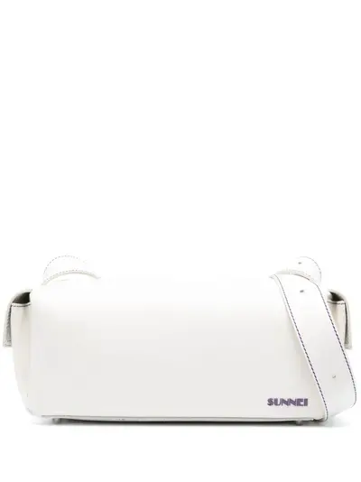 off-white/purple calf leather smooth grain contrast stitching silver-tone hardware embossed logo to the front metal feet two side flap pockets top zip fastening adjustable shoulder strap main compartment internal logo patch internal zip-fastening pocket