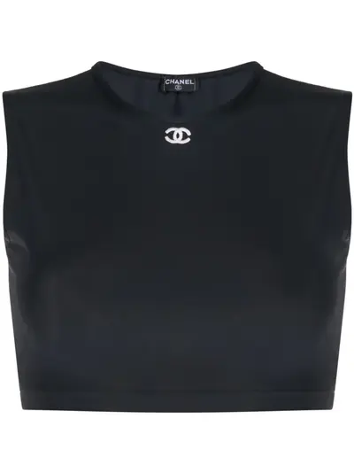 circa 1990s black/white stretch-design signature interlocking CC logo round neck sleeveless straight hem cropped Condition: GOOD. This previously owned and used item is in good condition with minimal signs of use. This may include fading of material or plating and scratches.