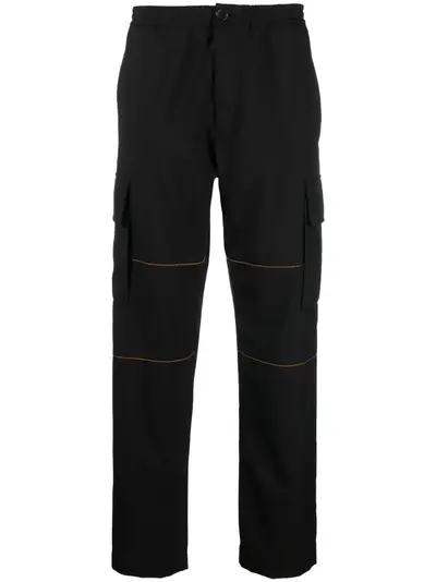black virgin wool contrast stitching elasticated waistband front button and zip fastening two side inset pockets two side flap pockets two rear button-fastening pockets straight leg