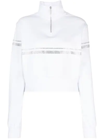white cotton glitter detailing logo print to the front crystal embellishment funnel neck half front zip fastening long sleeves straight hem