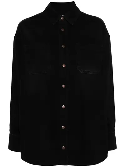 black cotton denim classic collar drop shoulder long sleeves buttoned cuffs two chest patch pockets curved hem logo-debossed buttons front press-stud fastening