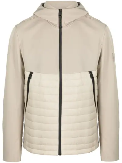 light beige stretch-cotton padded design logo patch at the sleeve high neck classic hood front zip fastening side two-way zip fastening long sleeves straight hem