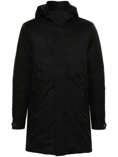 black feather down waterproof padded design detachable drawstring hood funnel neck long sleeves press-stud fastening cuffs two side zip-fastening pockets logo tag to the front quilted lining internal zip-fastening pockets internal slip pocket straight hem concealed front two-way zip fastening branded zip puller concealed front press-stud fastening