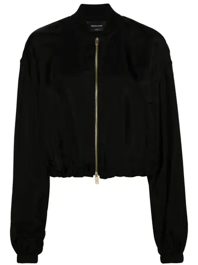 black twill weave satin finish ribbed band collar front two-way zip fastening drop shoulder long sleeves elasticated cuffs two side welt pockets drawstring hem full lining