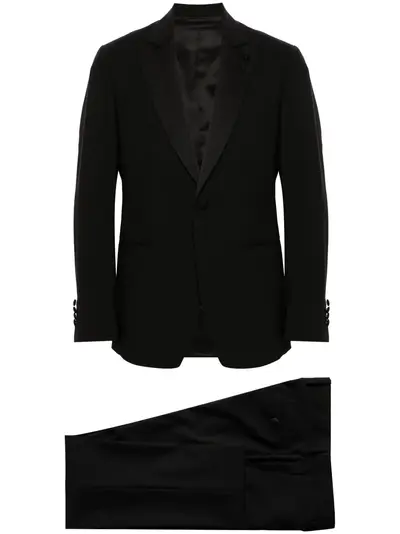 black stretch-wool tailored design Jacket: brooch detail peak lapels front button fastening shoulder pads long sleeves buttoned cuffs chest welt pocket two front jetted pockets internal jetted pocket English rear vents straight hem satin lining Trousers: belt loops front button and zip fastening tapered leg two side slit pockets two rear button-fastening jetted pockets straight hem