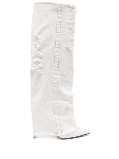 white nappa leather/cotton denim contrast stitching ripped detailing pointed toe cuffed design slip-on style 120mm stiletto heel branded insole leather lining