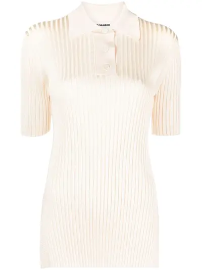 ivory white wide ribbed side slits slim cut polo collar short front button fastening half-length sleeves straight hem