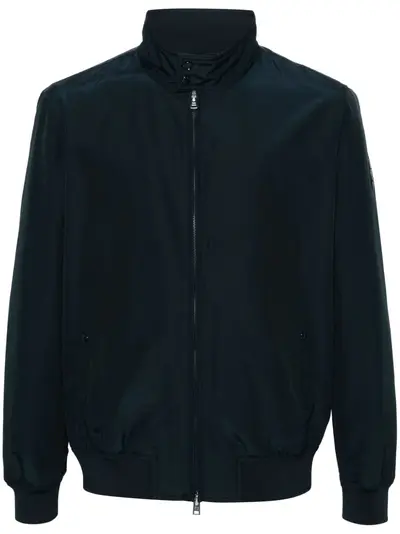 navy blue cotton blend shell high neck long sleeves logo patch at the sleeve front two stud-fastening pockets ribbed cuffs and hem full lining internal slip pocket front zip and press-stud fastening