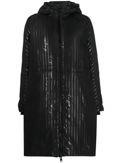 black all-over logo print vertical stripe pattern drawstring hood front zip fastening long sleeves belted cuffs two side slit pockets knee-length straight hem