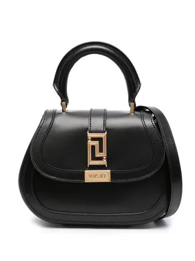 black calf leather signature La Greca plaque gold-tone logo plaque single circular top handle logo stamp to the rear foldover top with magnetic fastening main compartment internal slip pocket metal feet detachable shoulder strap