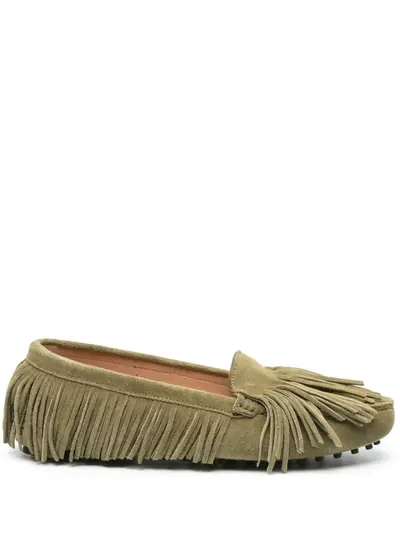 sage green suede fringe detailing tonal stitching branded leather insole slip-on style round toe rubber sole