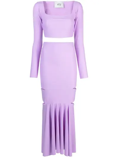 lilac purple Top: square neck long sleeves cropped Skirt: mid-rise cut-out detailing flared hem