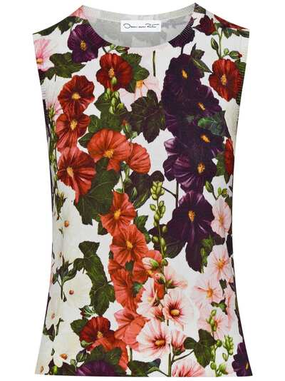 white/multicolour cotton blend all-over floral print round neck sleeveless straight hem MODEL IS 5'10.5" / 180 CM AND WEARING SIZE 2