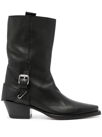 black calf leather pebbled texture pointed toe silver-tone buckle fastening double pull-tab at the opening mid-calf length branded leather insole 55mm low block heel leather sole slip-on style