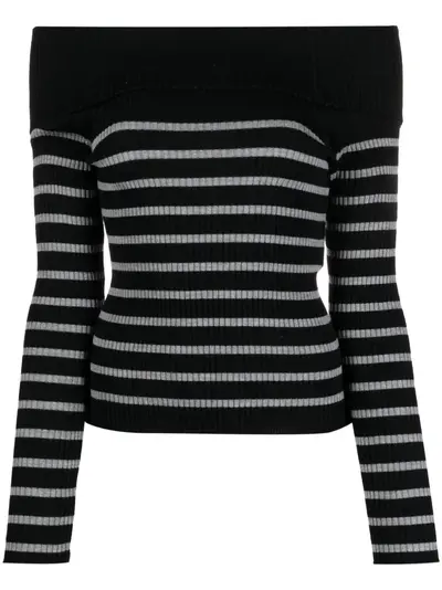 black/grey virgin wool ribbed knit horizontal stripe pattern Bardot neckline off-shoulder long sleeves straight hem