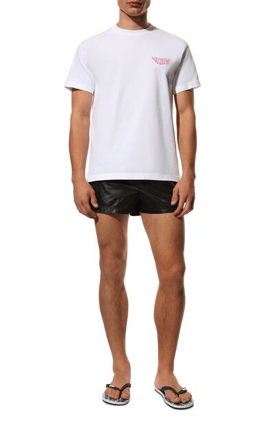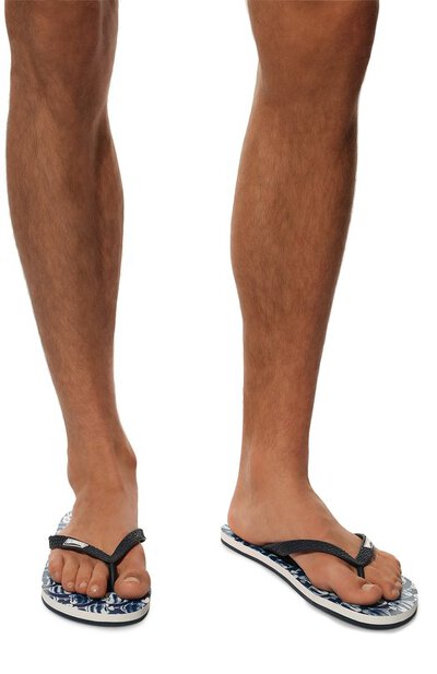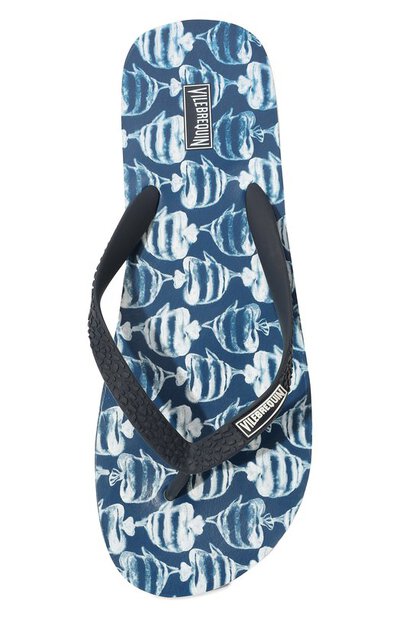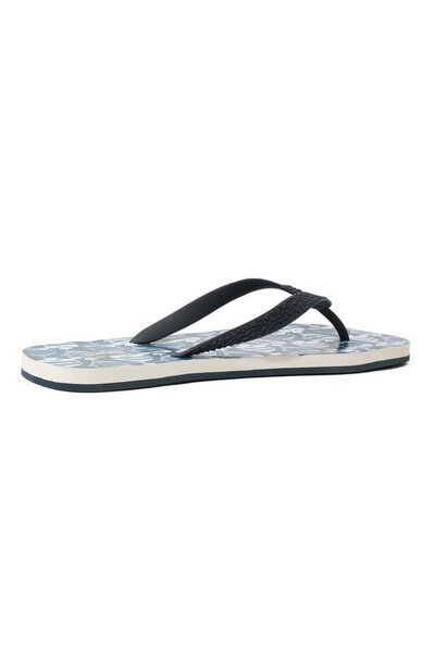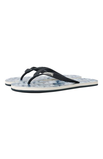 Темно-синие шлепанцы с гибкой подошвой выполнены из мягкой матовой резины. Гладкая нескользящая стелька украшена принтами-рыбами, на V-образных узких ремешках — рельефное тиснение и белые логотипы марки. Вьетнамки настолько легкие, что почти не ощущаются на ногах.