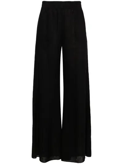 black linen semi-sheer construction two side inset pockets full-length unlined wide leg elasticated waistband