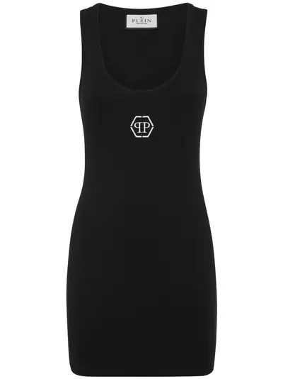 black cotton blend ribbed knit appliqué logo embroidered logo to the front scoop neck sleeveless thigh-length straight hem