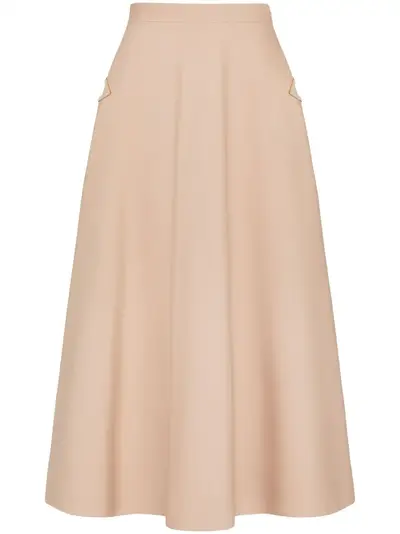 Valentino Ready To Wear pink virgin wool blend crepe texture A-line VGold detail high waist The full look includes Valentino Garavani accessories.