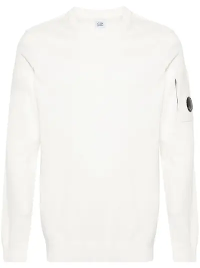 off-white cotton knitted construction fine knit crew neck long sleeves sleeve zip pocket signature Goggles detail ribbed cuffs and hem straight hem authenticity QR code C.P. Company suggests removing any detachable accessories before washing.