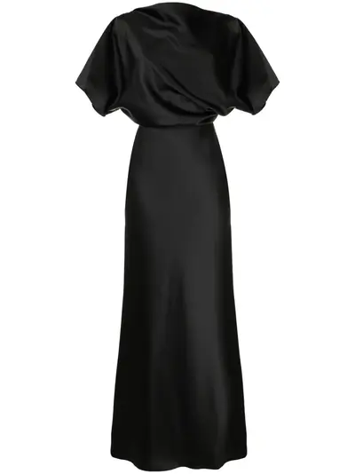 black satin finish round neck short sleeves concealed rear zip fastening straight hem ankle-length