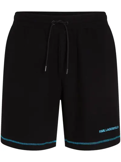 jet black organic cotton waffle knit embroidered logo to the front contrast stitching drawstring waist straight leg two side inset pockets rear welt pocket knee-length